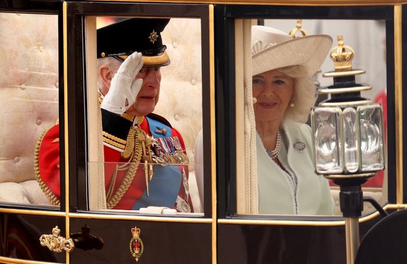 Hollie Adams/ReutersAt the ceremony, from his carriage, King Charles gave the royal salute in his first Trooping the Colour since his cancer diagnosis. He inspected the troops in Whitehall from a carriage, rather than on horseback. Queen Camilla was with him wearing a pale green silk crepe dress and coat from Anna Valentine and hat by Philip Treacy, along with her Grenadier Guards military brooch.