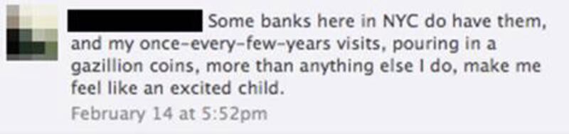 Never seen one in NYC? Anybody know if such a thing exists? My heart sank. It seemed impossible. It couldn’t be true. But then I read the celebrity journalist’s opening post about her change again and checked her other recent posts, most about the musicals and other classic films she was watching, and I had to admit it: she sounded sincere. Maybe she was blessed, or incredibly hard-working, or so resourceful that it hadn’t ever come to turning in her pocket change for groceries. Maybe she glided through her days on the upper tiers of currency and only used quarters for parking meters, tipping baristas, gumball machines. Then there was the alternative: the celebrity journalist needed the change, and the breezy tone of her initial post had been calculated to make it seem as if she didn’t. In either case, from the time of the celebrity journalist’s first post on Facebook asking the hive for advice about what to do with her change, it had taken only two minutes for her to get her first reply from the smiling man with the goatee. Two minutes. And more poured in from there. Despite the arm’s length approach to Coinstar (“one of those machines at the supermarket”), I did feel partially vindicated. At least I wasn’t the only person reading the thread who had a highly developed relationship to my pocket change.