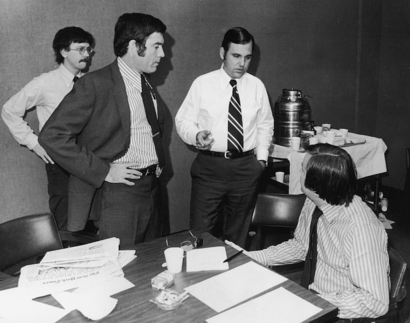 Presidential assistant and Press Secretary, Ron Zeigler (C), speaks with Dan Rather (L) and other reporters in the press room of the Naval Hospital, where U.S. President Richard Nixon was admitted for pneumonia, July 13, 1973, in Washington, D.C.