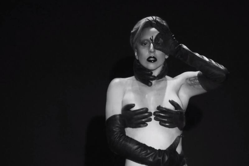 1) The Breast-Grabbing Leather Gloves: Is this an optical illusion, or is Gaga literally getting felt up by her bra? For a majority of the music video, Gaga rocks a leather-glove bandeau that at points moves and caresses her breasts. Plus, she has a matching glove-choker, and actual coordinating leather gloves.