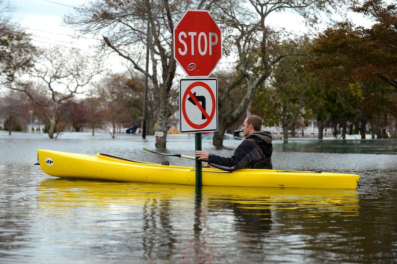 With so many towns and cities flooded, several states advised residents to boil water before consuming it. That didn’t stop some from using the water in other ways, however. Here, volunteer firefighter Mike McCormick pauses at a stop sign while paddling a canoe down the streets of his town.