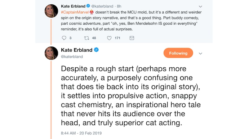 It has come to my attention that people really like Marvel movies. Hmm. Who knew? So it should be of interest to those people that there are those who have apparently seen Captain Marvel, and they liked it. It is weird! There is a cat! Thanos is fucked! (I don’t know what that means!)