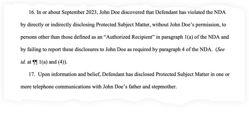 “[A]s a result of Defendant’s unauthorized disclosure of Protected Subject Matter to John Doe’s father and stepmother, other third parties are now in possession of John Doe’s Protected Subject Matter, including his sister,” the lawsuit states.
