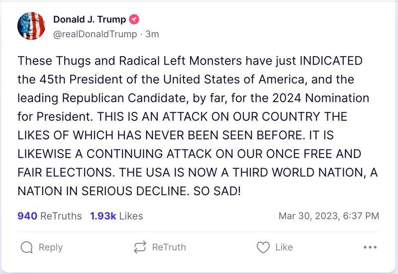 He also issued another furious rant on his social media platform Truth Social, complete with an unfortunate, all-caps misspelling saying he had been “INDICATED.”