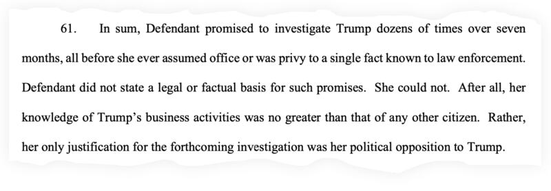 “It is clear that Defendant lacked any basis to investigate Trump, but she did so anyway, and in doing so, she abandoned all pretenses of acting with impartiality and in accordance with prosecutorial standards,” the suit contends.