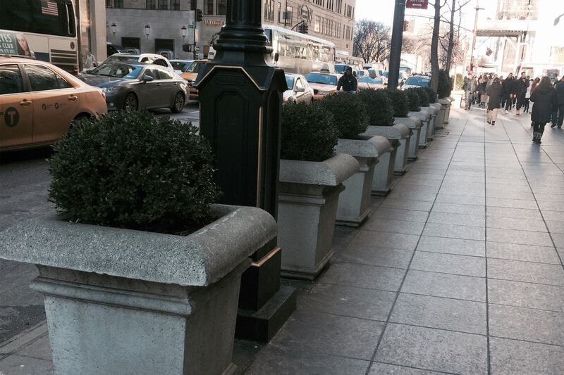 He meant the large cement planters that Trump has placed outside the tower, not to ward off possible terrorists but to keep away peddlers.