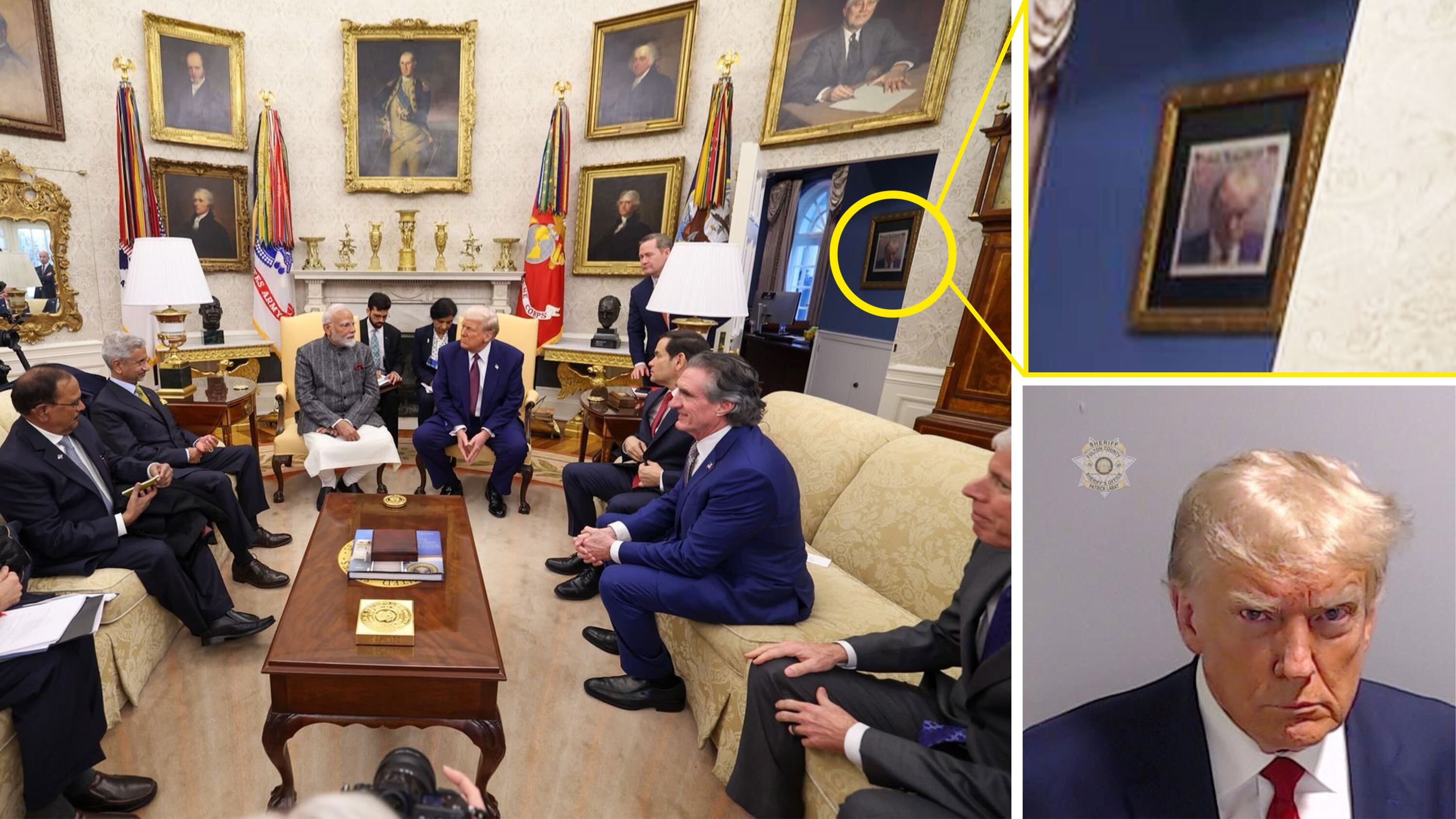 The photo, shared on Modi’s X account following his meeting with Trump on Thursday, appears to show the infamous booking photo framed and hung up just outside the Oval Office, suggesting the second term president has embraced the image as holding symbolic value within his administration.