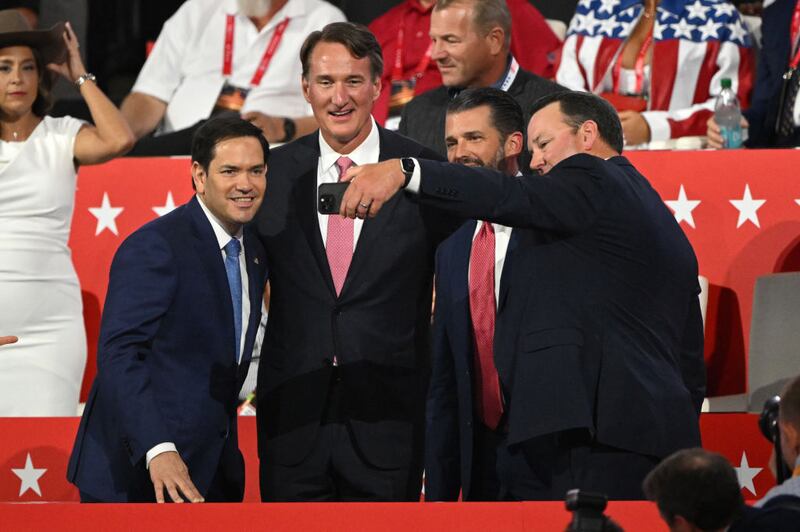 Sen. Marco Rubio, Virginia Gov. Glenn Youngkin, and Donald Trump Jr. attend the third day of the Republican National Convention in Milwaukee.