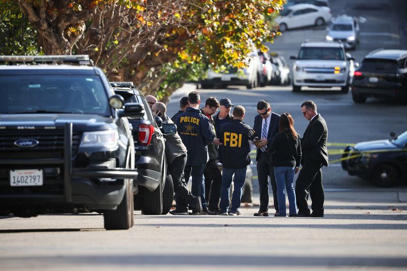 Federal Bureau of Investigation (FBI) takes measurements around Speaker of the United States House of Representatives Nancy Pelosi's home after her husband Paul Pelosi was assaulted with hammer inside their Pacific Heights home early morning on October 28, 2022 in San Francisco, California, United States.