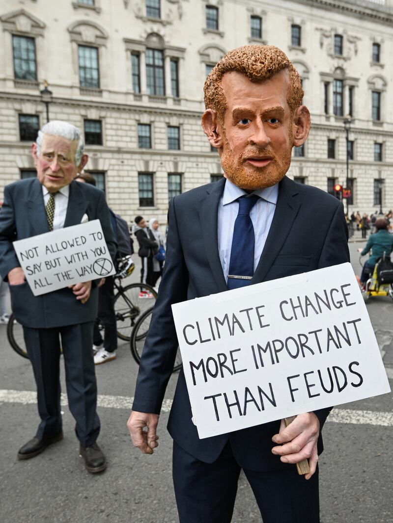 Extinction Rebellion activists wear costumes depicting Britain's King Charles and Prince Harry during a demonstration as a part of 'The Big One' event, in London, Britain, April 22, 2023.