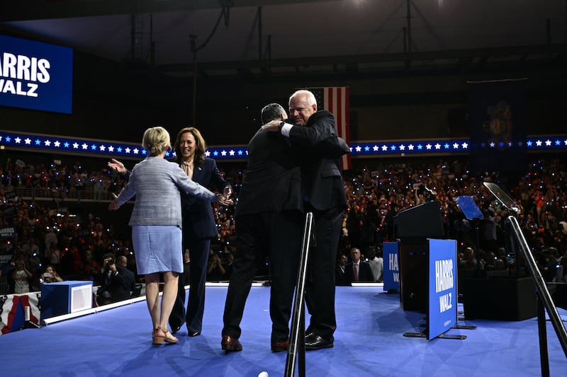 Before they shared the stage at the Democratic ticket’s first joint rally in Philadelphia last month, Emhoff had only met Walz briefly once before. “Then I didn’t see him until that night in Philly when we jumped up on the stage,” Emhoff said. “And so we kind of bonded backstage and we get up there and we just do this big bro bear hug. And I cannot tell you how many texts I got from my actual friends and actual family members, like, ‘You never hugged me like that! What’s going on? You literally just met this guy!”