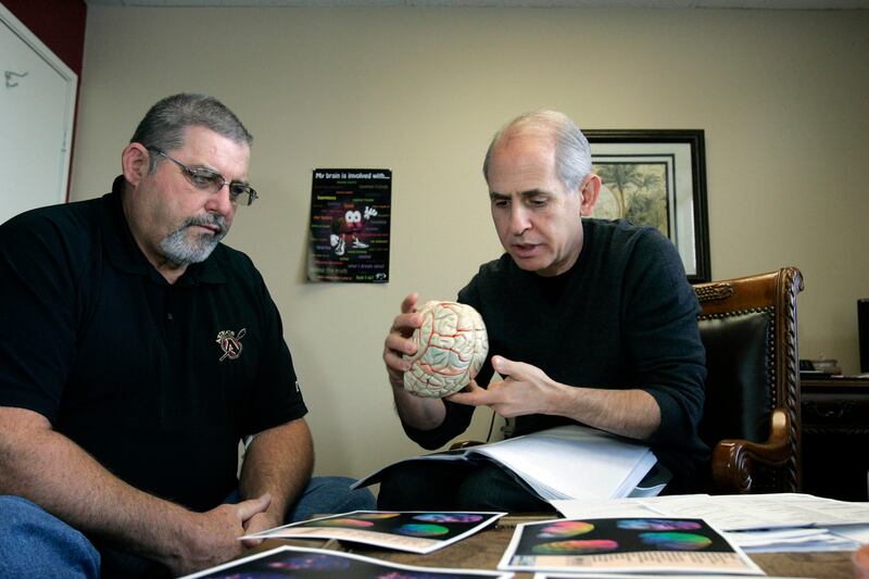 Dr. Daniel Amen, right, uses a brain model to explain what he is talking about as he goes over brain scan results with former football player Ed White in 2009.