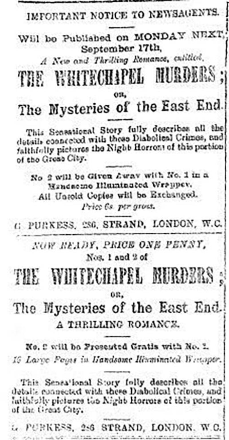 The murders were acts of profound misogyny and inhumanity, and, as such, windfalls for the periodicals of the day, especially Illustrated Police News, the weekly four-page newspaper popular among London’s largely unlettered working class for its elaborate illustrations, which covered the entire front page. The News and others wallowed in the murders, publishing images of the victims going about their daily business just before their gruesome deaths alongside drawings of their bodies and fanciful sketches of what the killer might have looked like.