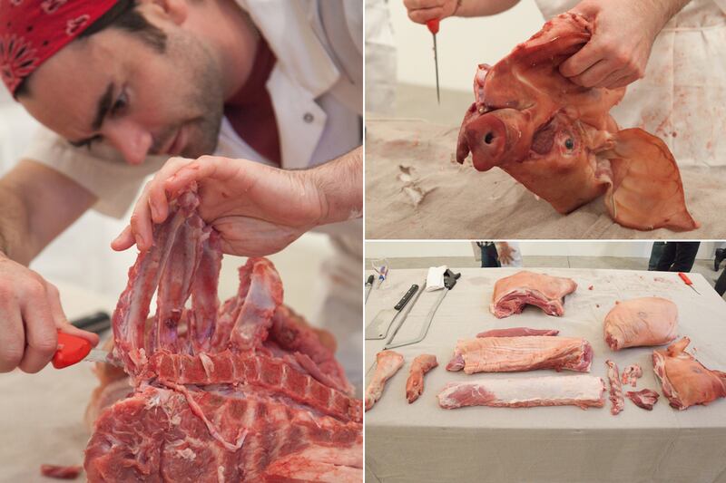 Arnone is 33, hirsute and handsome, his dark looks inherited from Sicilian ancestors. (He grew up in Southern California, and says his profession makes him a babe magnet: “‘You must have strong hands’—you get a lot of that.”) He runs his fingers over the dead beast, now stretched out on a table, and explains that “butchery is a beautiful thing, but it starts with a very violent act.” Our subject (or victim) would have been alive until a few days before, he says, and was probably nine or 10 months old. “This pig looks pretty nice, but I’ll see how stubborn it is when I cut it up.” (A row of nipples tell us that “it” is, or was, a “she”.) Later, after we’ve watched him do his cutting, and occasionally lent him a hand, Arnone proclaims her “a gentle animal,” since she allowed us to disjoint her without too much brute force. Aside from a wrench or two to break through the spine, speckling some viewers with offal, the butchery’s mostly a delicate act. With a few efficient gestures, Arnone extracts the tenderloin, proclaiming, “This is the work that I love.”