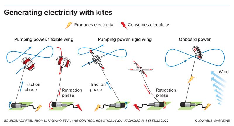 There’s also the problem of scale. Smaller kites are cheaper to make and easier to develop. But because the weight and drag of the tether increases with height, small kites don’t operate as well at 300 meters or higher, where the wind tends to be strongest. Companies want to scale up to larger, more efficient kites that can fly higher and produce megawatts of power. But that comes with expense and risk.