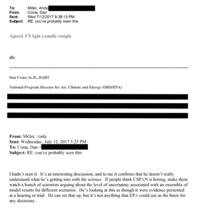 “It’s an interesting discussion, and to me it confirms that he doesn’t really understand what he’s getting into with the science,” Miller wrote on June 12, 2017. “If people think CSPAN is boring, make them watch a bunch of scientists arguing about the level of uncertainty associated with an ensemble of model results for different scenarios. He’s looking at this as though it were evidence presented at a hearing or trial. He can set that up, but it’s not anything the EPA could use as the basis for any decisions.”