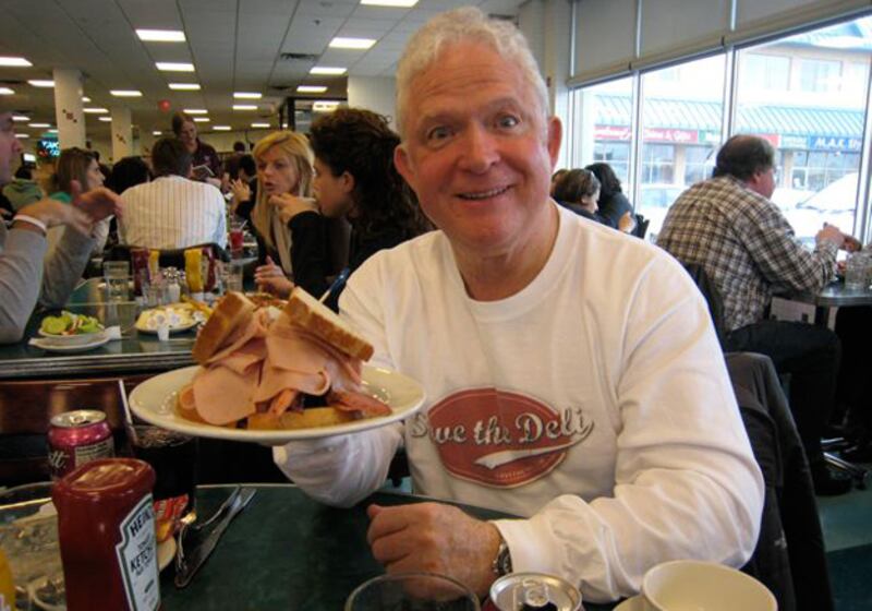 The book author’s father, Michael Sax, brandishing a smoked meat and stuffed chicken sandwich.