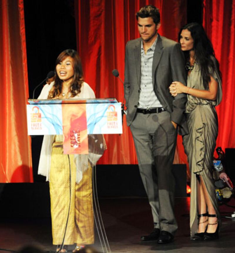 Sina Vann thought she was going on a vacation to Cambodia with a friend. But she was stepping into a trap. At 13, she was sold into slavery and was trapped in a brothel, where she was raped by dozens of men almost every day for two years, and was tortured when she didn’t comply with the owners’ every wish. "When I stepped into Cambodia, my childhood ended," Vann says, "and the dark side of my life started." Vann was saved by a raid organized by anti-slavery activist Somaly Mam. She was brought to Mam’s rescue shelter, where she now works inspiring other former sex slaves to rebuild their lives. She was honored this week with a Fredrick Douglass Award from the Free the Slaves Foundation. Demi Moore and Ashton Kutcher presented her with the award.