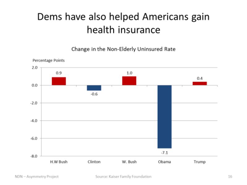 The rate of non-elderly uninsured has increased under all three GOP presidents but decreased under the Democrats, quite spectacularly under Obama.