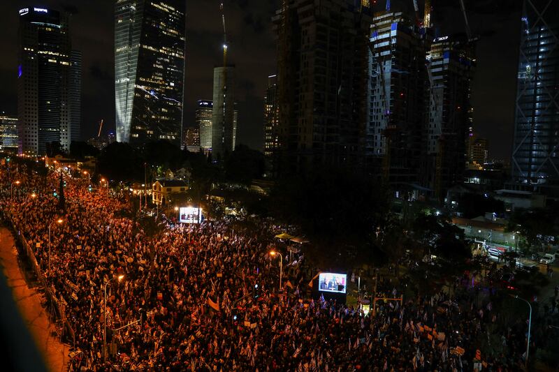 Israelis protest against Prime Minister Benjamin Netanyahu's new right-wing coalition and its proposed judicial reforms to reduce powers of the Supreme Court in Tel Aviv, Israel February 4, 2023.