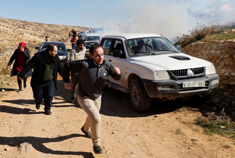 Palestinians run for cover from tear gas during a protest against settlements in Masafer Yatta near Hebron, in the Israeli-occupied West Bank, January 20,2023.