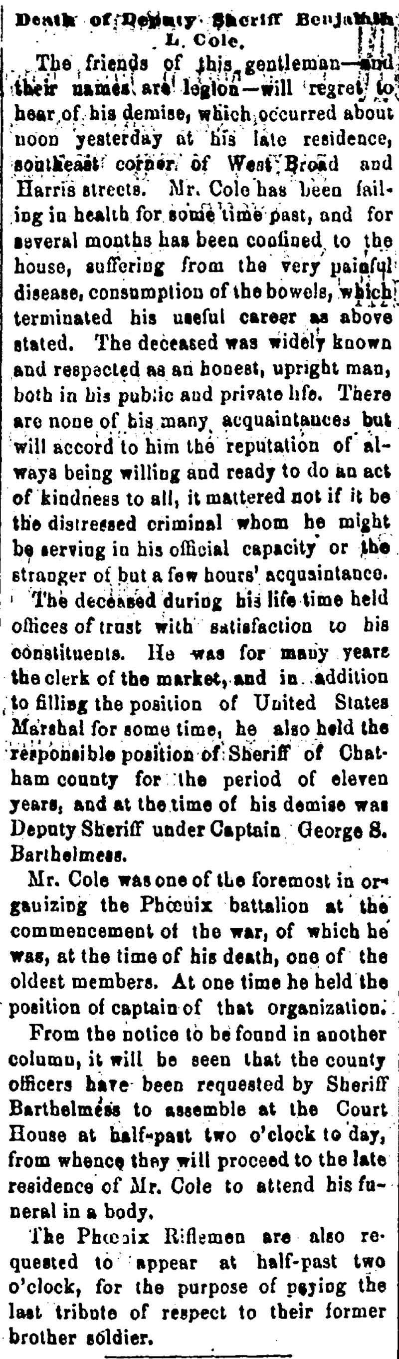 After the Civil War, Cole still acted as deputy sheriff. In 1871, shortly before his death, the local paper wrote of an incident where Cole assisted in the apprehension of a drayman, or wagon driver. After the wanted, a black man named Jim Josephs, picked up the arresting officer, walked around the lot with him, and threw him into a crowd of other draymen, Cole appeared and an arrest was made.