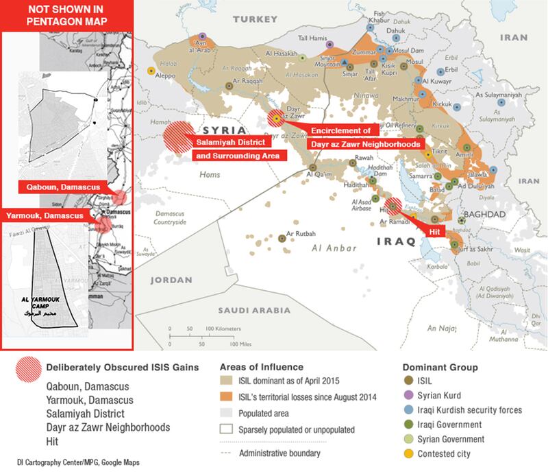 Pushing ISIS back is clearly a good step. But the information from the Pentagon is, at best, misleading and incomplete, experts in the region and people on the ground tell The Daily Beast. They said the map misinforms the public about how effective the U.S.-led effort to beat back ISIS has actually been. The map released by the Pentagon excludes inconvenient facts in some parts, and obscures them in others.