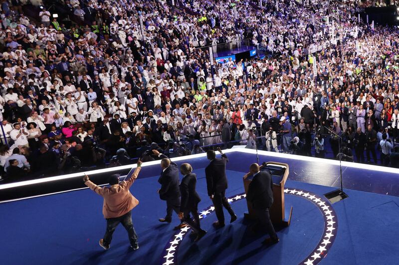 Reverend Al Sharpton (C) walks with Yusef Salaam, Korey Wise, Raymond Santana and Kevin Richardson—members of the Central Park Five, who were exonerated after being wrongly convicted of rape as teenagers and incarcerated for years—on the fourth and last day of the Democratic National Convention in Chicago.