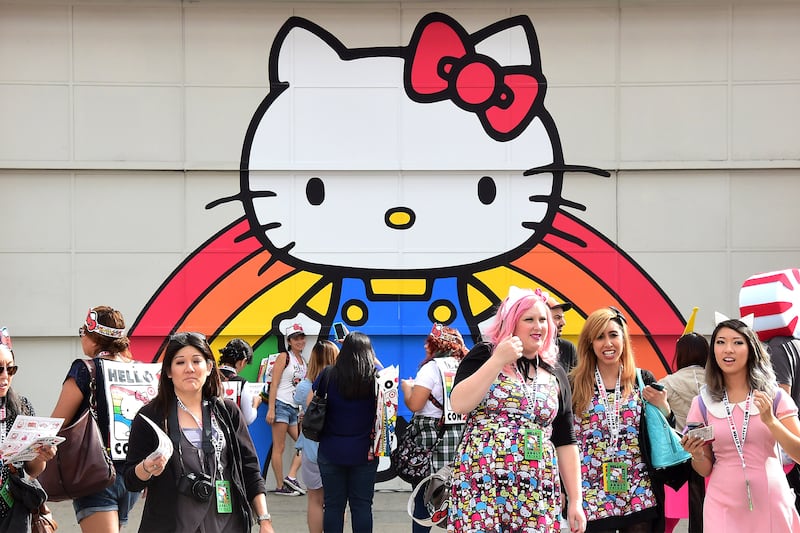 The next day I ask the super fans on the “Guys Love Hello Kitty Too!” panel why she had no competition at the time in their lives when they were getting into Hello Kitty. What about Strawberry Shortcake? Mickey Mouse? Tin Tin? “The other characters talk too much,” says Prince Robbie, the founder of a small cosmetics company called Adam Haus who wears barely visible Hello Kitty contact lenses over his dark eyes. He fell in love with Hello Kitty as a teen when he was going through his goth phase—and she was too.