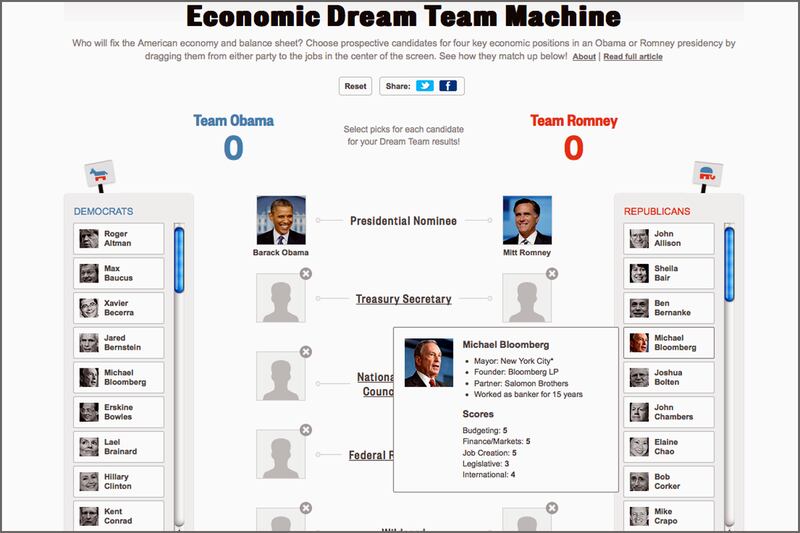 As the Economic Dream Team Machine shows, both sides have many potential corporate executives, veteran politicians and government officials from whom to choose. But neither candidate needs to rely solely on his own party. In fact, it would be wise for whoever wins the election in November to choose a bridge-builder from the other side of the aisle. Either candidate could, for instance, try to lure New York Mayor Michael Bloomberg to take on the role of Budget Czar or some other temporary economic position. Similarly, Romney could tap Democrat Erskine Bowles, co-chair of the National Commission on Fiscal Responsibility and Reform, the group created two years ago by the president to look at fiscal matters, to encourage bipartisanship.