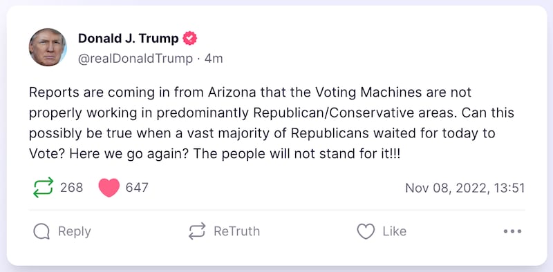 Trump himself took to his flailing Twitter clone, Truth Social, to undermine faith in Maricopa’s results, where the polls opened at 6 a.m. local time, before the results are even in.