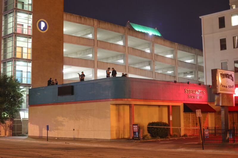The heavily armed men—many bearing rifles, night-vision goggles, and wearing camouflage—were seen on the roof of Stewart’s Pawn Shop, the perimeter of the Shell station, and in the Hampton Inn parking lot. When asked why they were present, one militia member, who gave his name only as Angry Spongebob, said the owner of the Shell had received threats against the business.