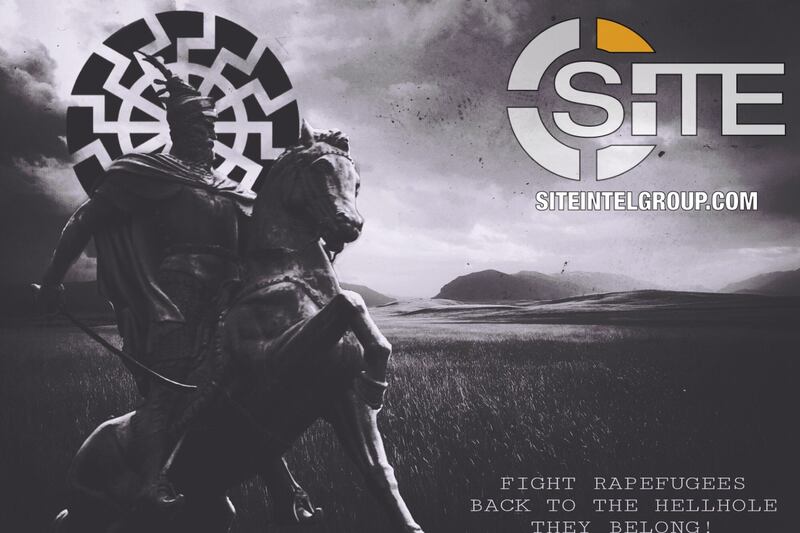 Artwork distributed across far-right Telegram channels and chat groups using the Nazi Black Sun icon and a statue of Skanderbeg, a historical military figure who rebelled against the Ottoman empire. Declares: “Fight rapefugees back to the hellhole they belong!”
