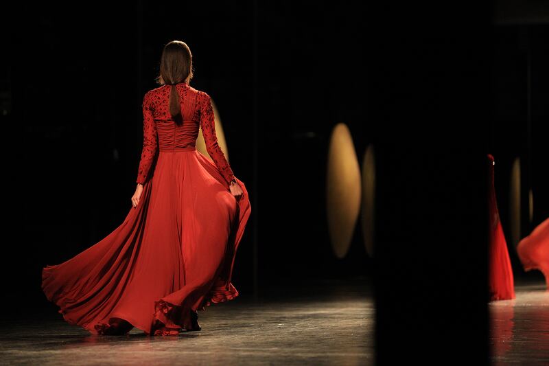 It's unfortunate that a leopard g-string-clad streaker crashed the Prabal Gurung runway early Saturday afternoon, as the audience then became more fixated on the nude man than what is possibly one of Gurung's most successful collections to date. The models didn’t miss a beat, however, and continued to parade down the runway alongside six oversized golden gongs. The décor—and collection—paid tribute to the Nepalese designer's heritage, particularly the Mustang region, which Gurung described as "one of the last remaining Shangri-Las." Straying away from the tight fitting pencil skirts, closely-tailored trousers, and vibrant neons of last season, Gurung made even the most chunky knits elegant, pairing oversized sweaters with chiffon or silk skirts that hit just at the knee and strappy sandals with tiny bells attached at the heels, creating a soft jingle alongside the powerfully robust soundtrack. Gurung particularly focused on elaborate drapery this season, showing off his abilities—and versatility—in a range of sleeveless tops and cocktail dresses. The show closed with four flowing chiffon gowns—in orange, red, crimson, and navy—all featuring slight embellishments, a high neck, and, except for the closing look on Joan Smalls, subtle cut-outs along the midriff. It was Gurung's use of warm hues that provided a refreshing breath of air amid the mostly monochromatic palette thus far.