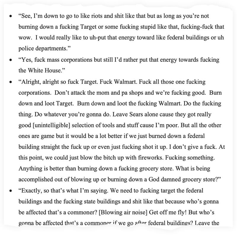 “This shit started out being a fucking way to kill feds,” McKillips allegedly said in an audio recording posted to a Signal chat room last year in which he talked about “burning down federal buildings and shooting federal agents.”