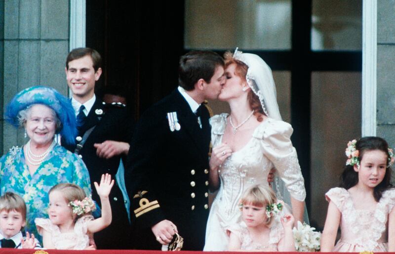 Prince Andrew is seen kissing Sarah Ferguson on the balcony, after their wedding ceremony at Buckingham Palace in this photo. Queen Elizabeth the Queen Mother and Prince Edward stand to the right of the couple.