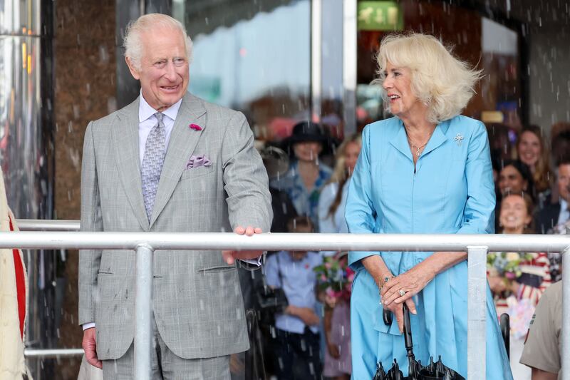 King Charles III and Queen Camilla watch The King’s Parade under torrential rain during an official visit to Jersey on July 15, 2024 in St Helier, Jersey.