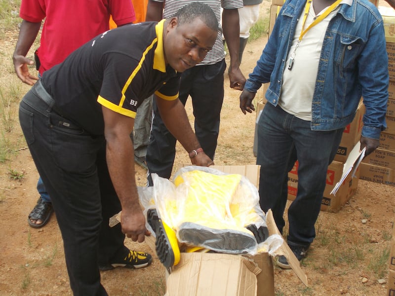 Crouching towards a dirt road strewn with pebbles, Emmanuel Boyah, a Liberian primary health care manager , grips a box of enormous yellow rubber boots with both hands.