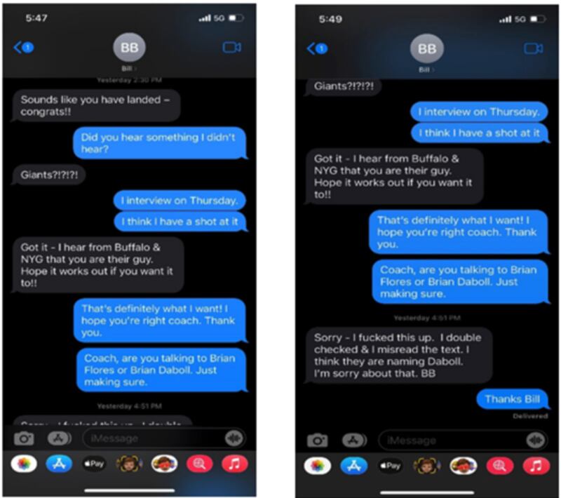 The lawsuit also contains screengrabs of text messages between Flores and Belichick, who apparently thought he’d texted Daboll.