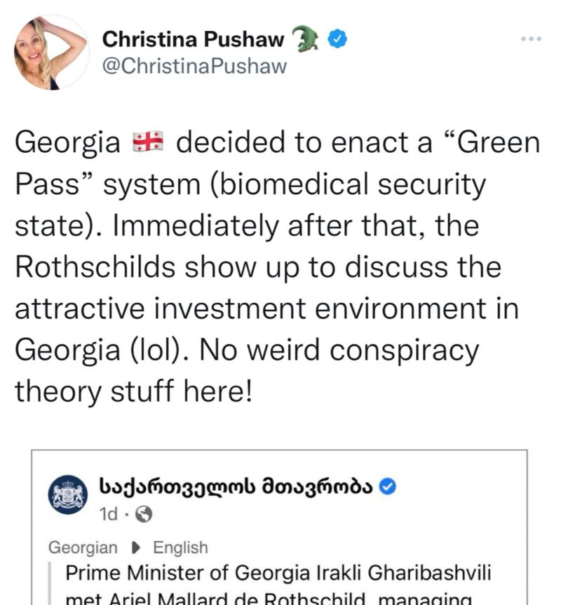 “Georgia decided to enact a ‘Green Pass’ system (biomedical security state). Immediately after that, the Rothschilds show up to discuss the attractive investment environment in Georgia (lol). No weird conspiracy theory stuff here!” she wrote Tuesday.