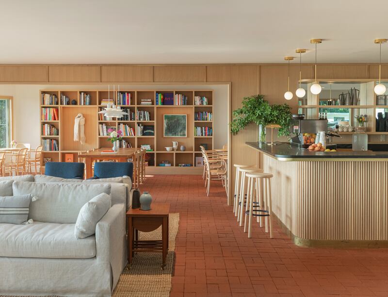 The second is the lobby space, housed in a dark green house at the start of the horseshoe. Inside is a warm interior with its brick floors, library, and coffee bar but one is immediately drawn to the giant windows looking out over the wraparound porch and lake.