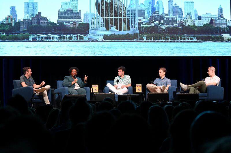 (L-R) Jon Favreau, Stacey Abrams, Jon Lovett, Tommy Vietor and Daniel Pfeiffer speak at a Pod Save America event in June.