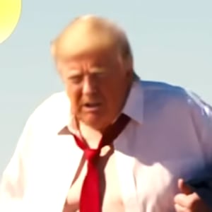 As its closing vignette, it also includes a deeply ironic pro-Trump political messaging ad in which a hyper-realistic AI version of an obese Trump waddles through the desert wearing few, then fewer, and eventually no clothes at all, ending with the naked president collapsing belly-up in the sun before the oversized-gut-punching final line: “His penis is teeny tiny, but his love for us is large.”