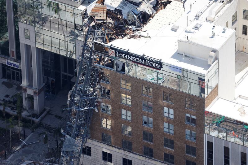 A crane smashed through the offices of the Tampa Bay Times in St. Petersburg, Florida as Hurricane Milton passed over the city.