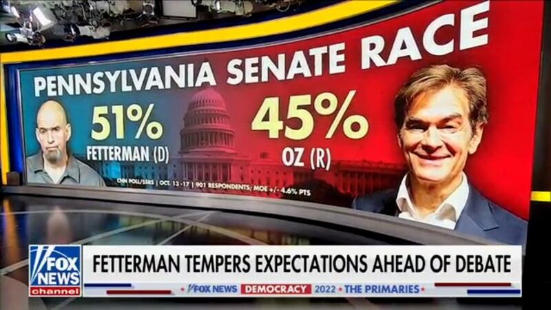 “It is a race that could determine which party controls the Senate. Polls show only single digits separating John Fetterman and Dr. Oz,” McEnany stated as the control room aired a large graphic of CNN’s latest survey showing Fetterman polling at 51 percent and Oz at 45 percent.