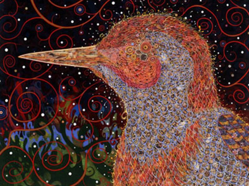 Wrapping up the show, Blue Geode, from 2007, tackles fractals, webs, galaxies, geodesic structures, and the big boom, while 2008’s Woodpecker puts collaged bits of people into the head of a bird that seemingly dreams of a psychedelic universe. In this work, and the other pieces on display, the artist reveals a spiritual journey through his art. In a telling manner, the drugs of the past have disappeared and been replaced by their own simulacra. Tomaselli has found a way to express the inner man constructively by transforming the dark side of his psyche into a visual language of enlightenment for all to share.