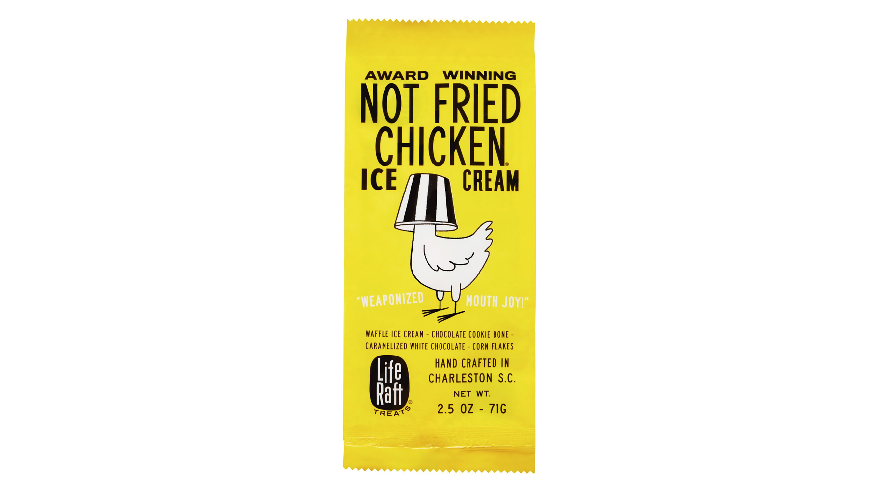 This delectable treat bears a striking resemblance to a fried chicken drumstick but holds a delicious secret within. Encased in a crispy coating of white chocolate and crushed corn flakes, you'll discover a delightful combination of waffle ice cream and a tantalizing chocolate-covered cookie "bone."