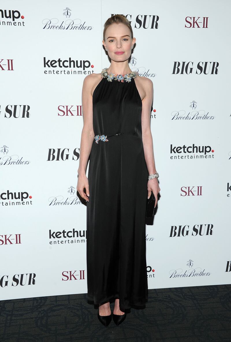 Kate Bosworth attends the Big Sur premiere on October 28 in NYC wearing a black floor-length Christopher Kane gown with subtle yet feminine floral appliqués at the neck and waist.