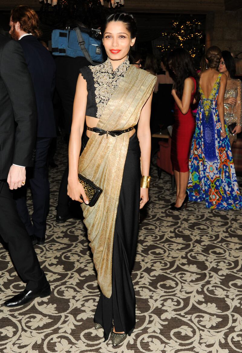 Actress Freida Pinto attended ASMALLWORLD's Holiday Weekend on December 15 in a black and gold Anamika Khanna Couture sari gown paired with a Gucci dragonfly belt and an Aquamarine cuff.
