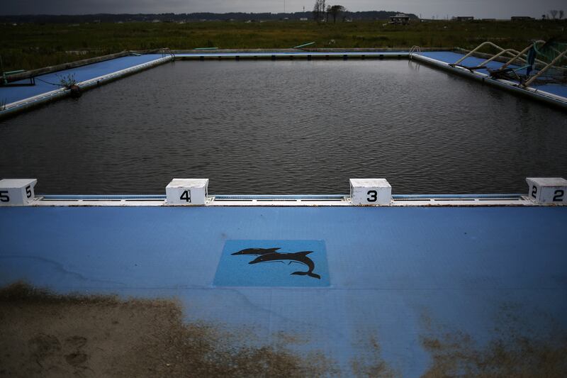 A drawing of two dolphins is seen at an abandoned swimming pool at the tsunami-destroyed coastal area of the evacuated town of Namie, only some 6 kilometers from the crippled Daiichi power plant.